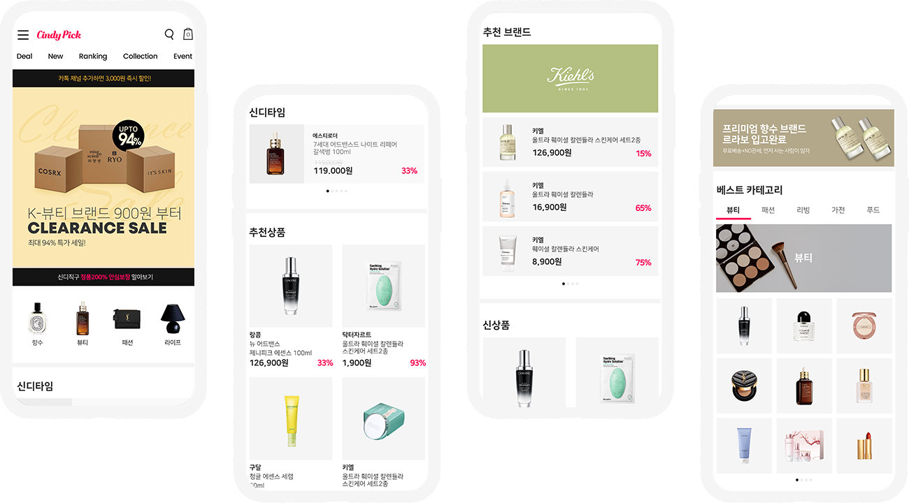 국내 no.1 디지털 무역 플랫폼 아이오 앤코 코리아에서 뷰티, 패션 등 다양한 국내외 유명 브랜드 상품을 최저가로 제공하는 쇼핑몰을 론칭 하였습니다. 이미 만들어져 있는 플랫폼을 이용하는 거라 CSS 수정이 한계가 있었지만 메인 페이지는 사용자께서 더 많은 브랜드의 상품을 볼 수 있도록 레이아웃을 구성하였으며, 블랙과 포인트 컬러를 사용하여 사이트의 일관성과 깔끔하고 유니크한 분위기를 표현하고자 제작하였습니다.