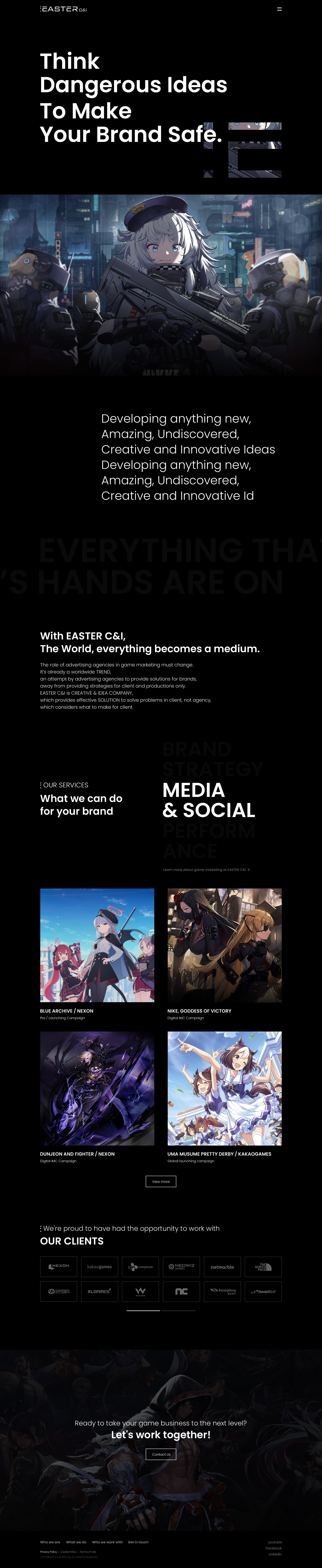 게임 마케팅에, 온&오프라인 통합 마케팅 등 국내 게임업종 Client들이 가장 선호하는 광고 회사이며 브랜드 아이덴티티를 강화하여 과감한 크리에이티브로 지금까지 쌓아온 이스터 그룹의 업적을 임팩트 있게 보여줄 수 있도록 제작하였습니다.