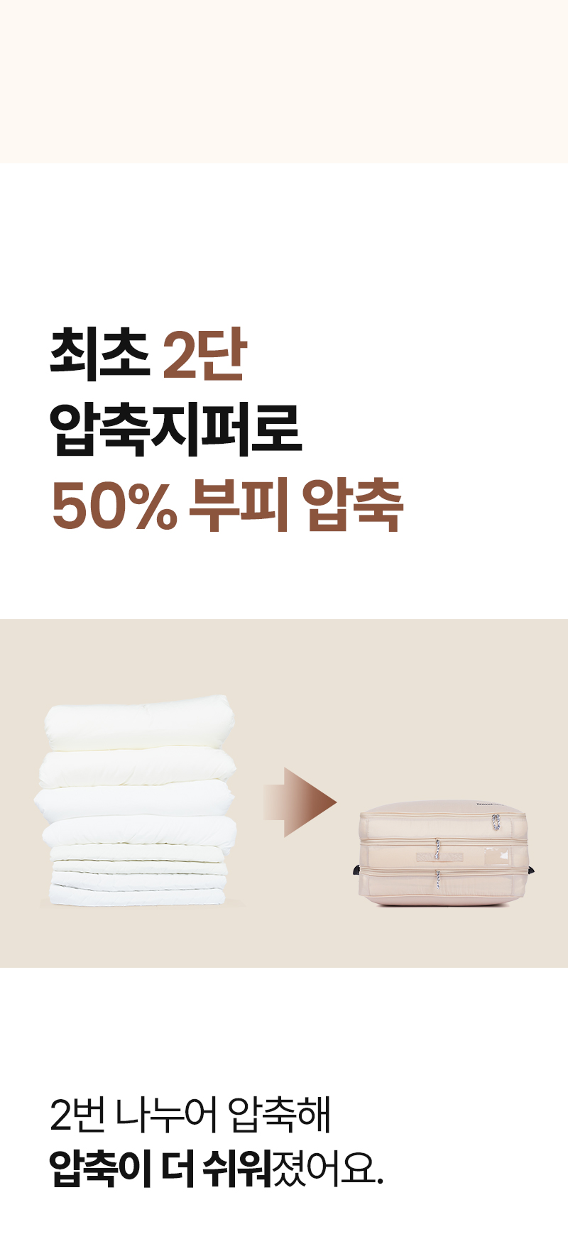 이불 압축 파우치는 옷장 내 부피를 최소화하고, 2단 압축 구조를 통해 공간 활용도를 극대화하는 제품입니다. 대형 사이즈로 겨울 이불과 두꺼운 의류까지 효율적으로 정리할 수 있다는 점이 핵심 강점입니다. 본 프로젝트에서는 이러한 제품의 강점을 고객이 직관적으로 인지할 수 있도록 단순한 시각 디자인을 넘어 정보 구조 설계 단계부터 참여했습니다. 별도의 기획안을 구성하여 기획자와 협업하였으며, 문제 제시 → 공간 절약 효과 강조 → 2단 압축 차별성 → 대형 수납력 시각화의 흐름으로 상세페이지 전체 구조를 설계했습니다. 또한 기존 제품 이미지의 퀄리티가 낮아 설득력이 부족한 상황이었기 때문에, 합성 및 리터칭 작업을 통해 사용 맥락을 보완하고 제품 완성도를 개선했습니다. 그 결과 시각적 신뢰도를 높이고, 구매 설득력을 강화할 수 있었습니다.