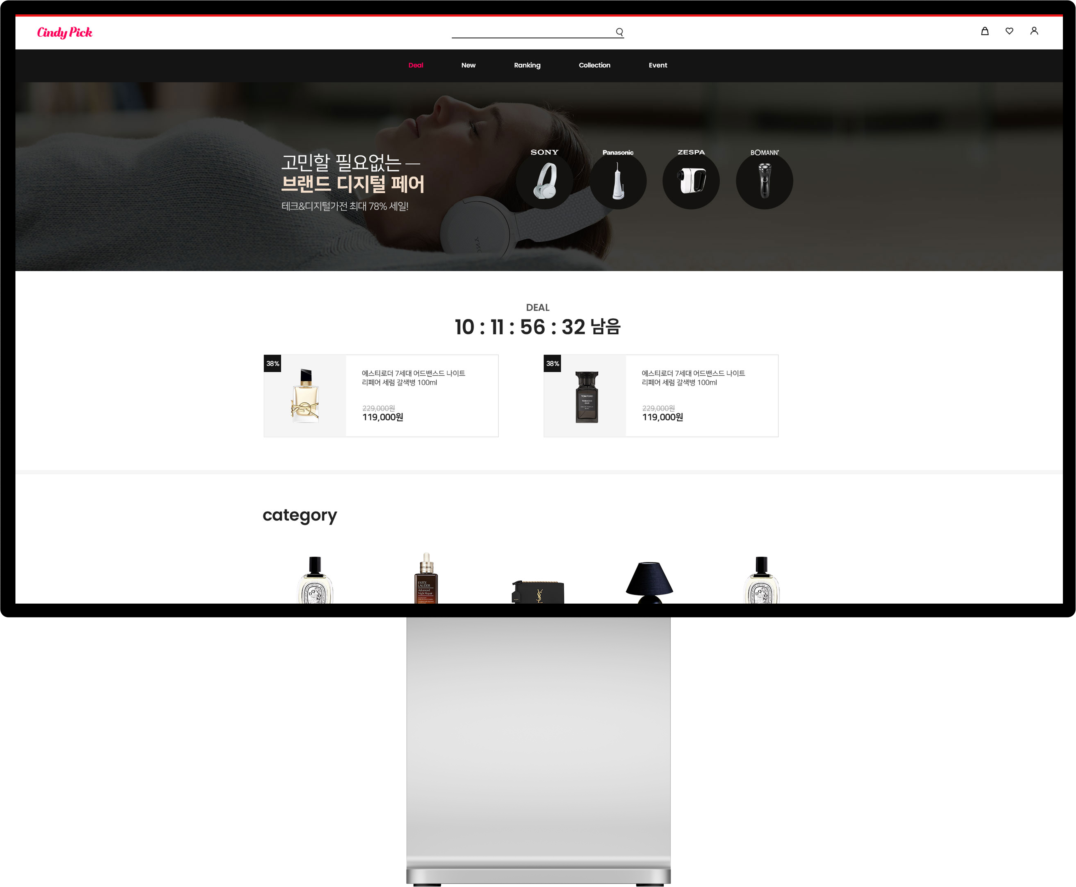 시대에 맞지 않은 일러스트와 아이콘들이 고가의 브랜드상품을 판매하는 쇼핑몰의 이미지를 떨어뜨려 오히려 어린이 장난감 판매에 어울리는 사이트 느낌이 듭니다. 기존 CSS 소스도 정리가 되지 않아 각각 레이아웃 여백도 맞지 않았으며 신디픽의 포인트 컬러와 여러 가지 많은 컬러를 사용하여 전체적으로 사이트의 일관성이 없어 보이는 느낌이 듭니다.