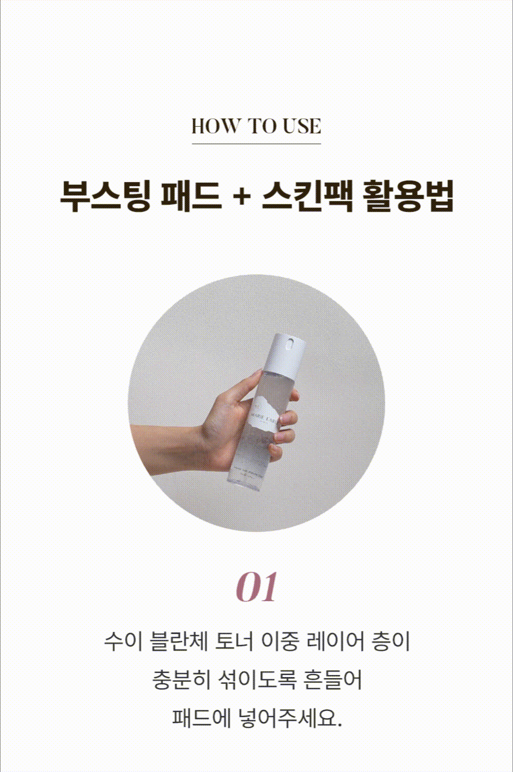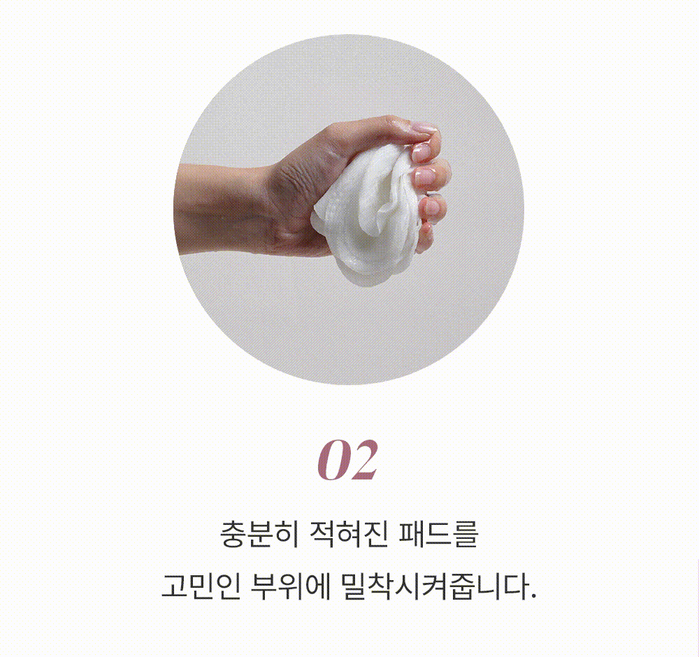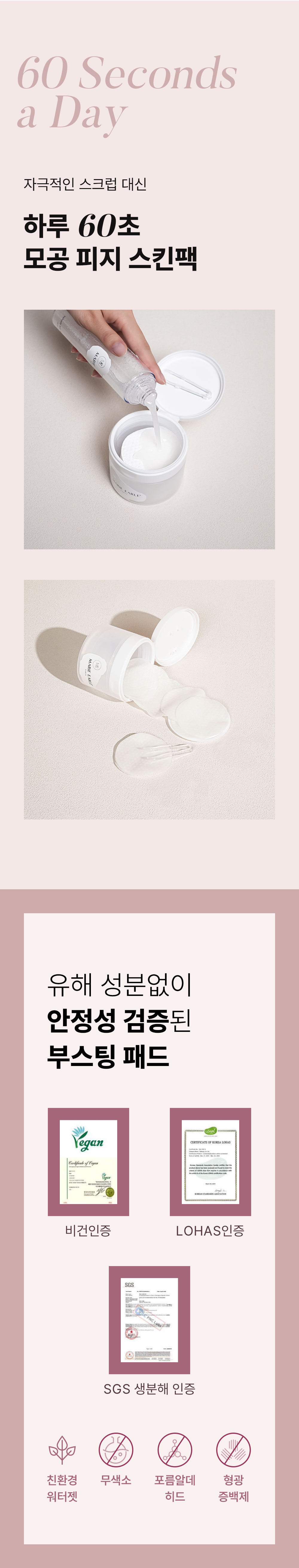 스킨팩 패드의 주원료인 목화솜을 모티브로 제작하였으며 60초 만으로도 간단하게 모공 정리와 수분 공급을 경험할 수 있고 사용자에게 보다 더 제품의 정보를 이해 도울 수 있도록 아이콘과 gif 영상 제작하여 디자인을 구현하였습니다.