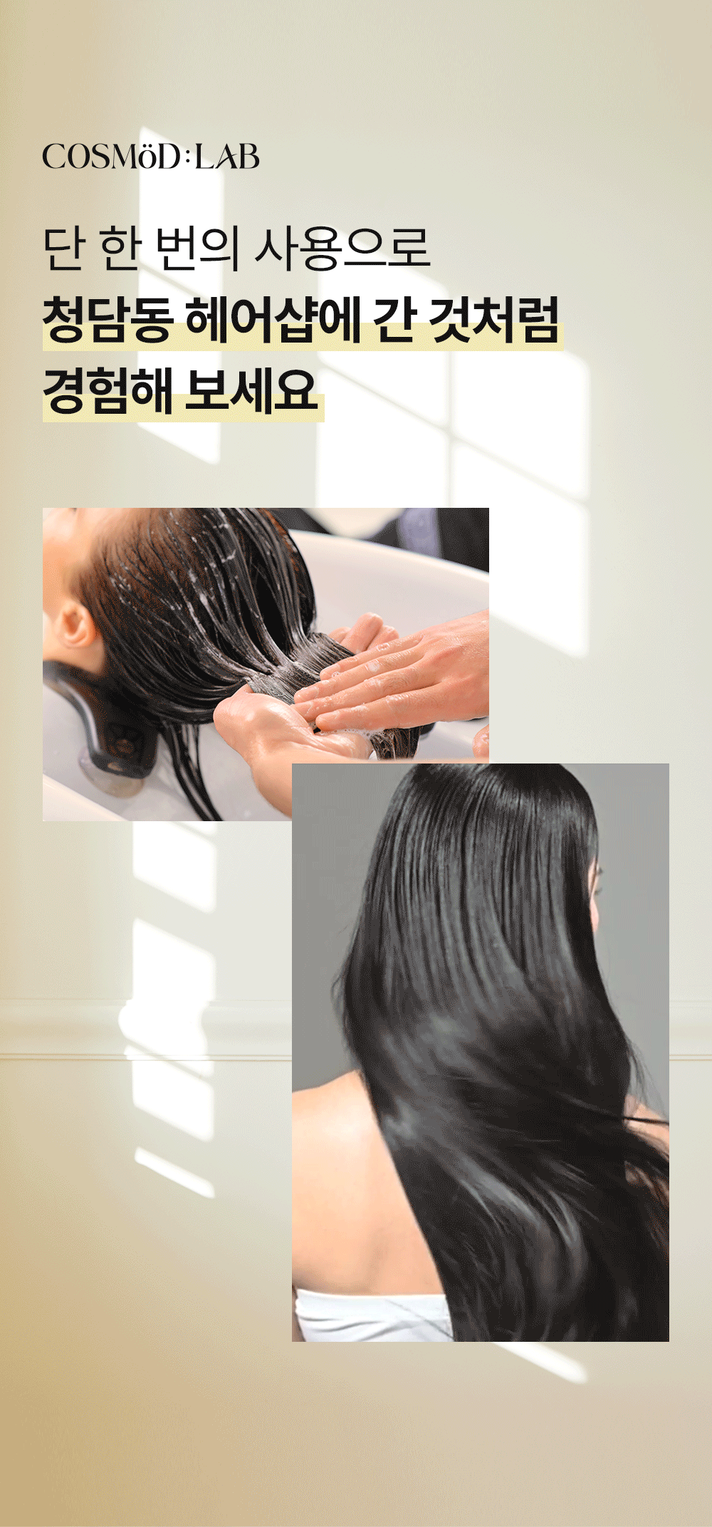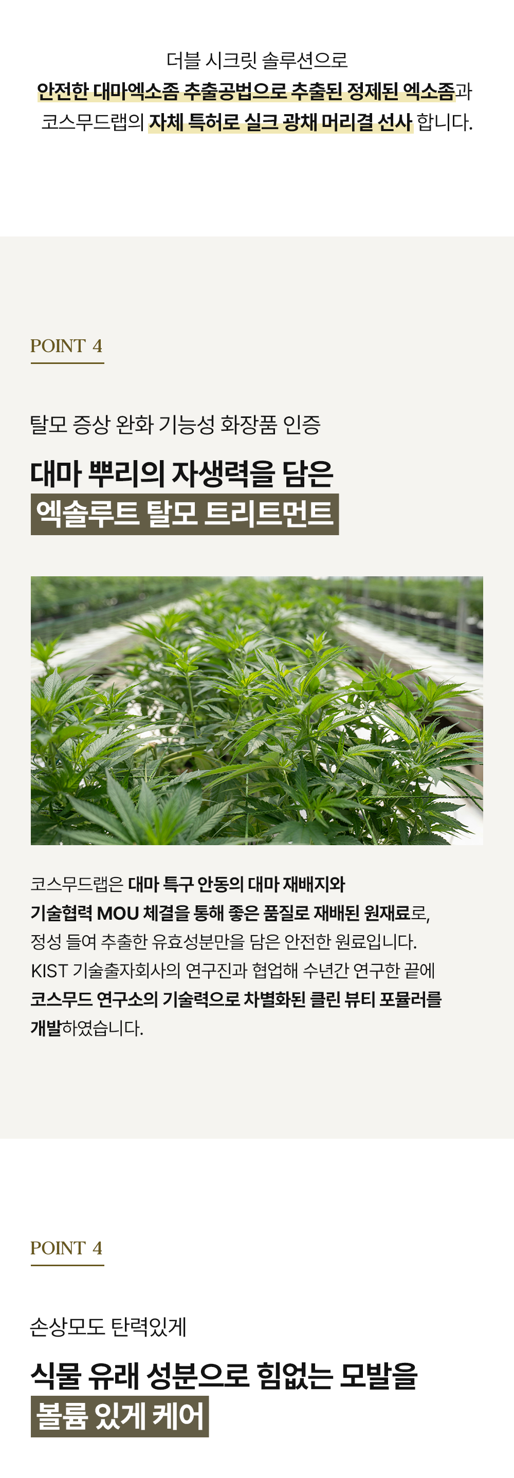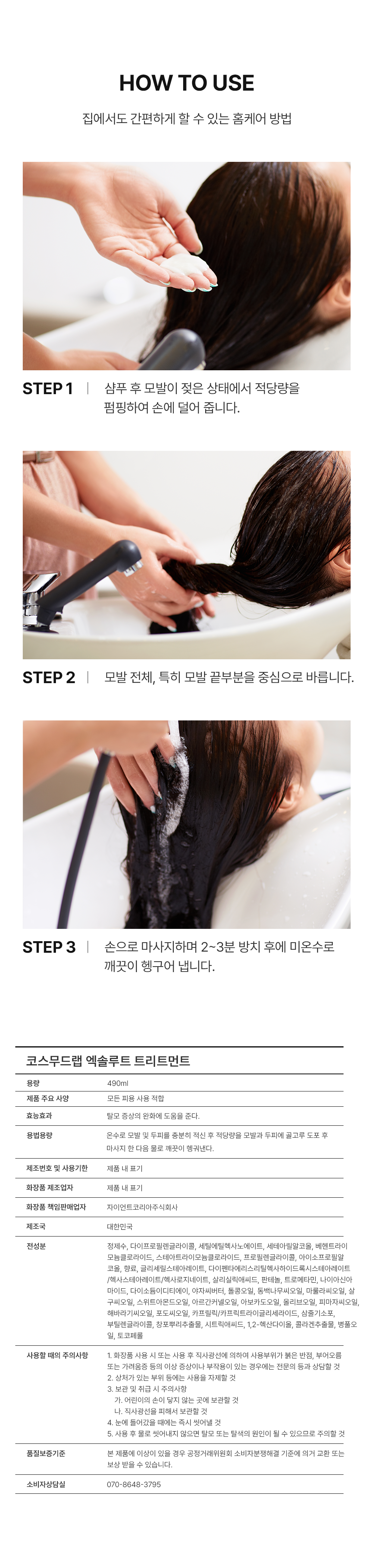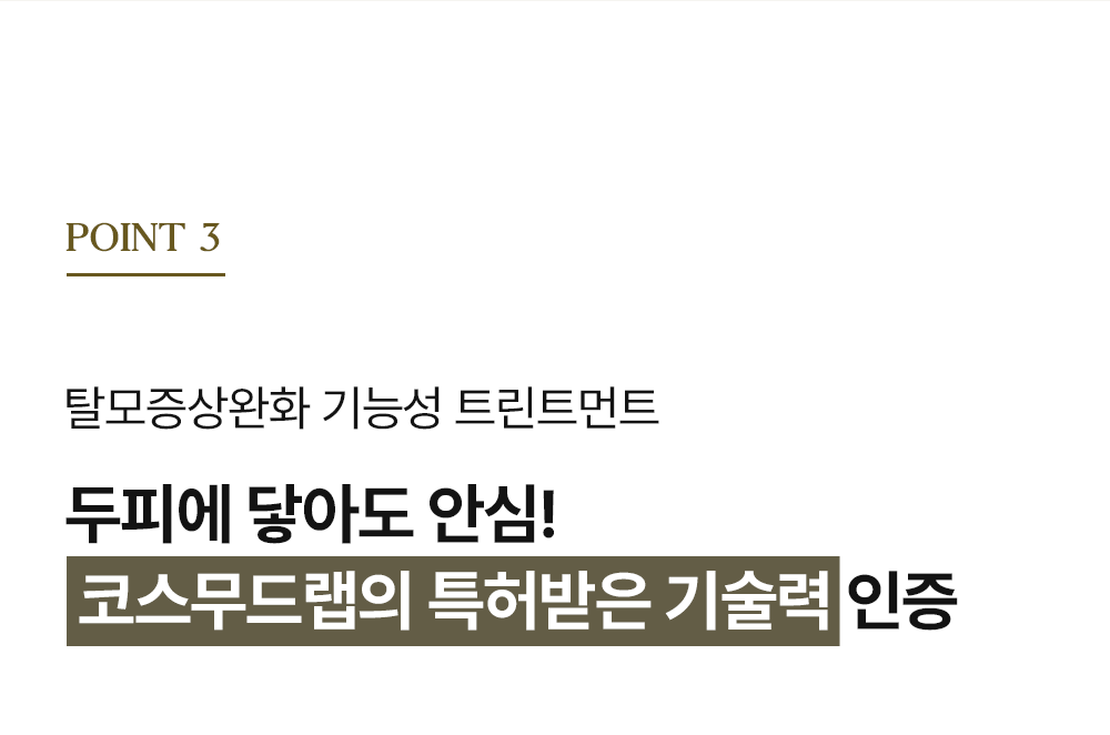 화장품 브랜드인 코스무드에서 새롭게 출시한 트리트먼트를 소개하는 페이지입니다. 세련됨과 고급스러움을 주면서 트린트먼트의 특징을 살려 사용자가 한눈에 쉽게 정보를 알 수 있게 디자인 제작하였습니다.