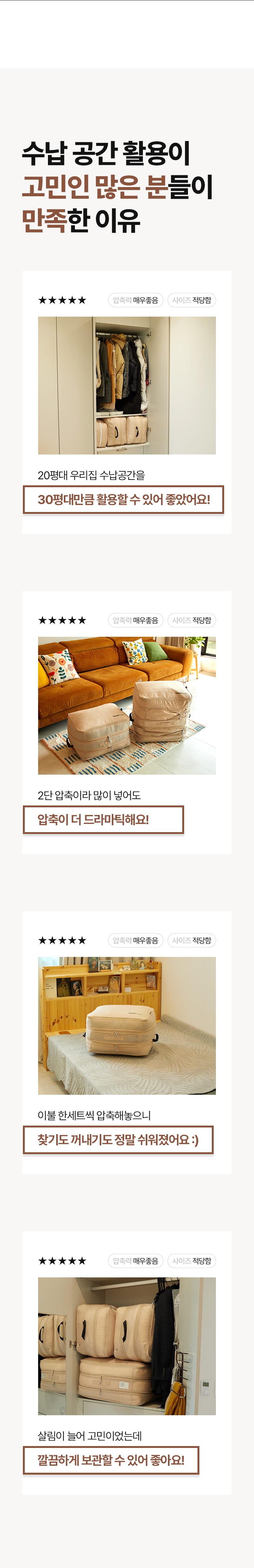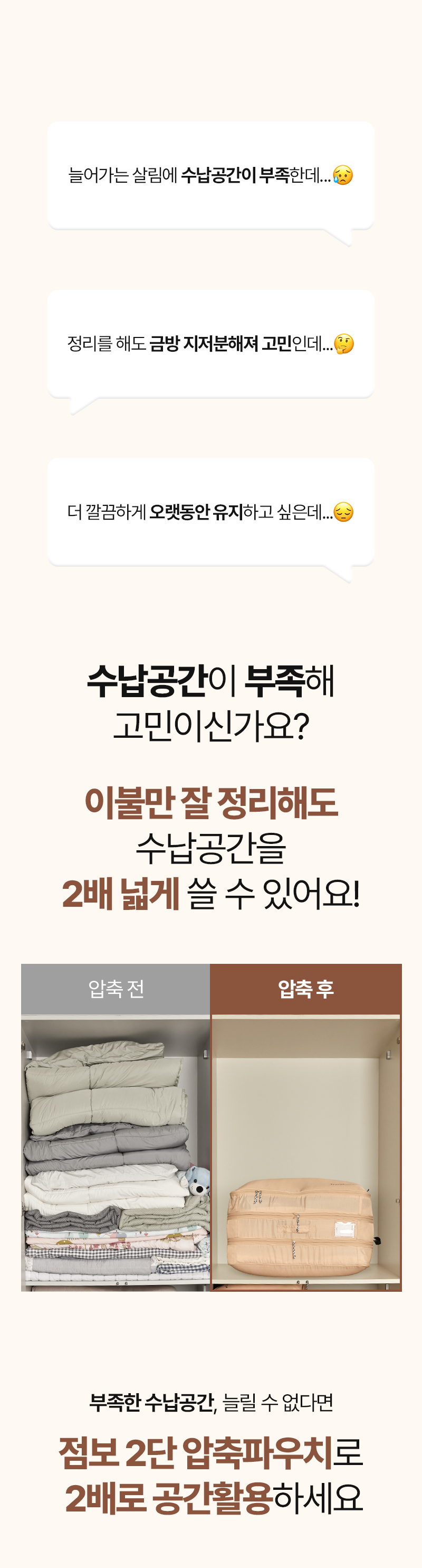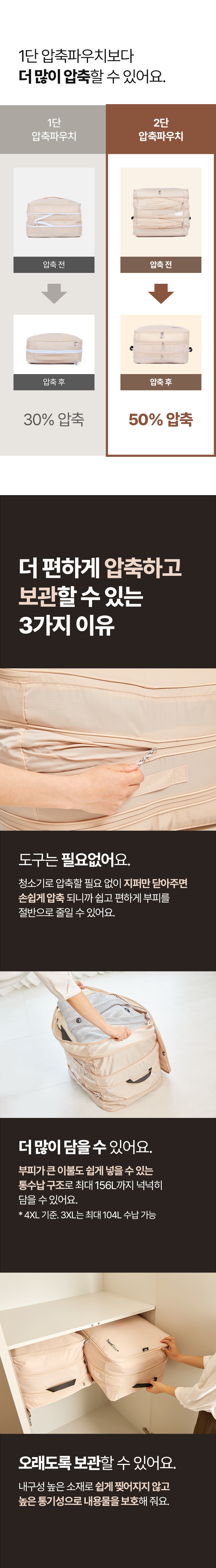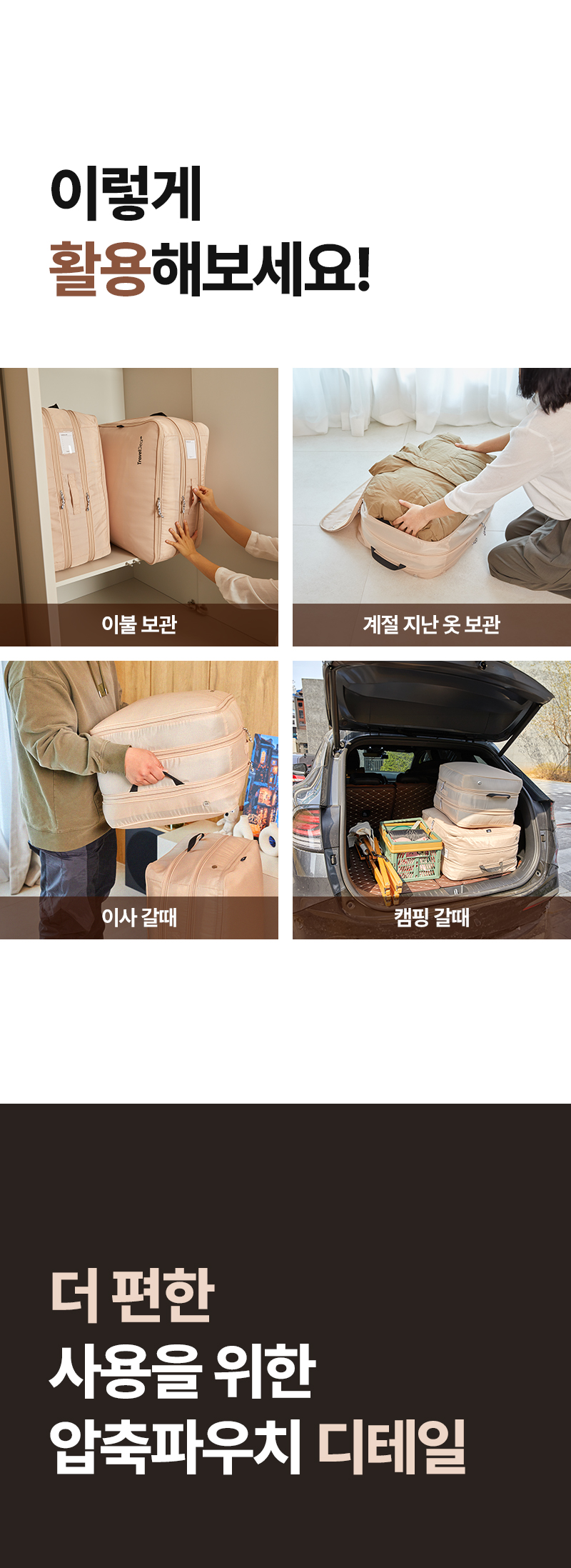 이불 압축 파우치는 옷장 내 부피를 최소화하고, 2단 압축 구조를 통해 공간 활용도를 극대화하는 제품입니다. 대형 사이즈로 겨울 이불과 두꺼운 의류까지 효율적으로 정리할 수 있다는 점이 핵심 강점입니다. 본 프로젝트에서는 이러한 제품의 강점을 고객이 직관적으로 인지할 수 있도록 단순한 시각 디자인을 넘어 정보 구조 설계 단계부터 참여했습니다. 별도의 기획안을 구성하여 기획자와 협업하였으며, 문제 제시 → 공간 절약 효과 강조 → 2단 압축 차별성 → 대형 수납력 시각화의 흐름으로 상세페이지 전체 구조를 설계했습니다. 또한 기존 제품 이미지의 퀄리티가 낮아 설득력이 부족한 상황이었기 때문에, 합성 및 리터칭 작업을 통해 사용 맥락을 보완하고 제품 완성도를 개선했습니다. 그 결과 시각적 신뢰도를 높이고, 구매 설득력을 강화할 수 있었습니다.