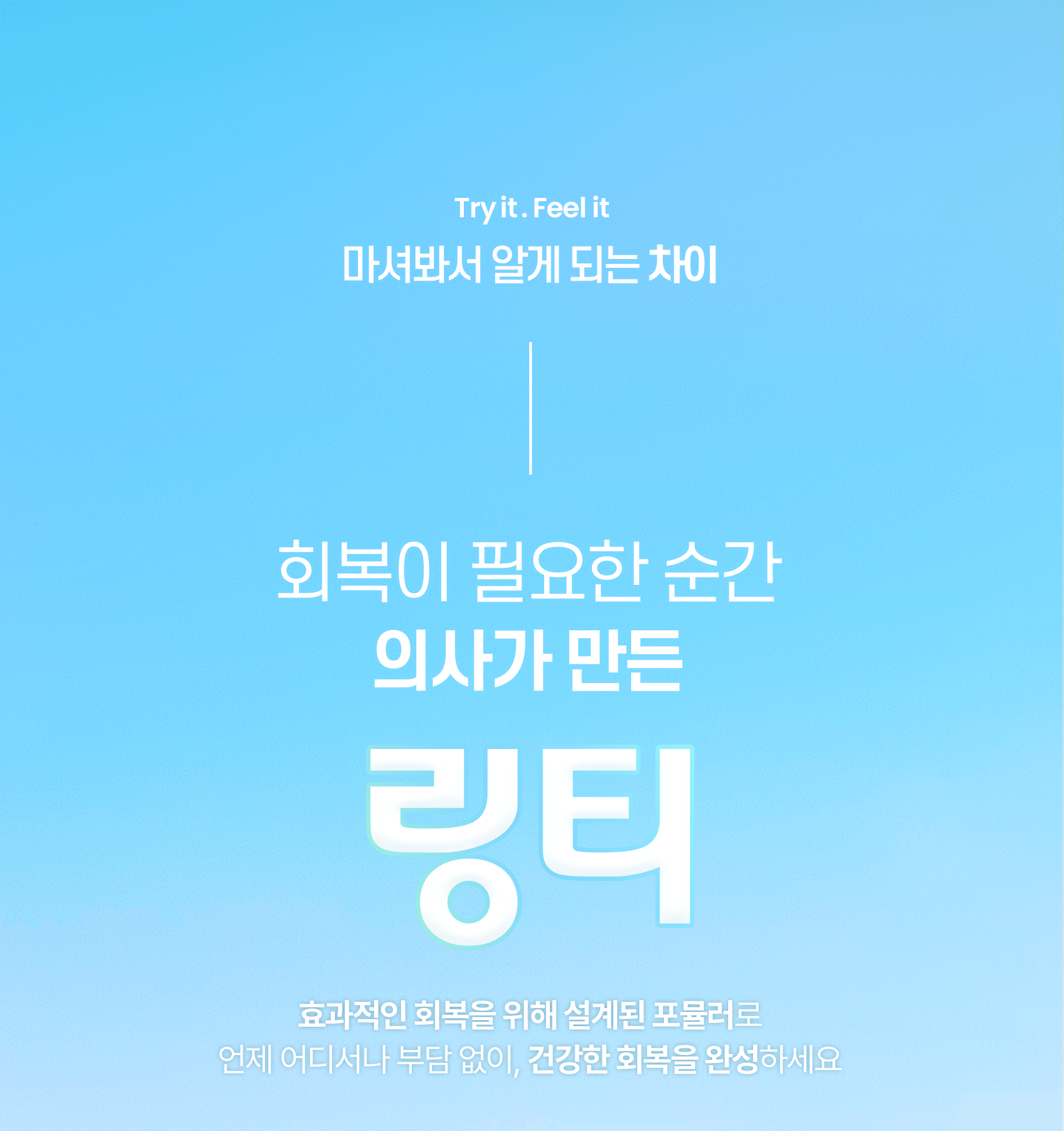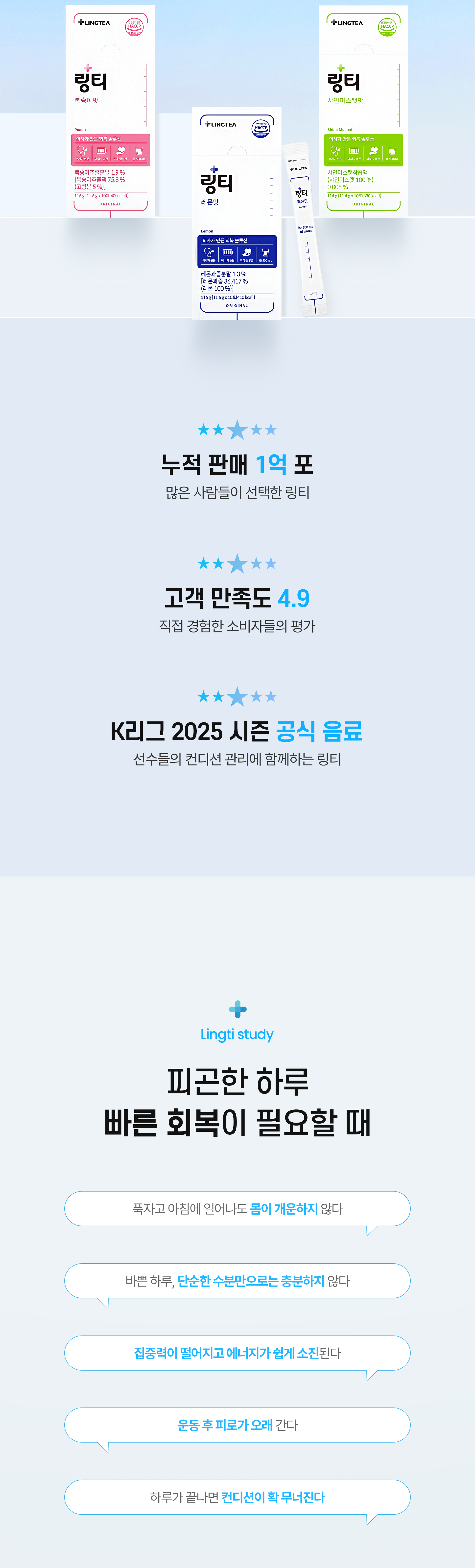 ‘의사가 만든 링티’라는 전문성을 인트로에서 분명하게 드러내고, 누적 판매 수치·고객 만족도·K리그 공식 음료 이력 등 신뢰를 뒷받침할 수 있는 요소들을 흐름에 맞게 배치했습니다.